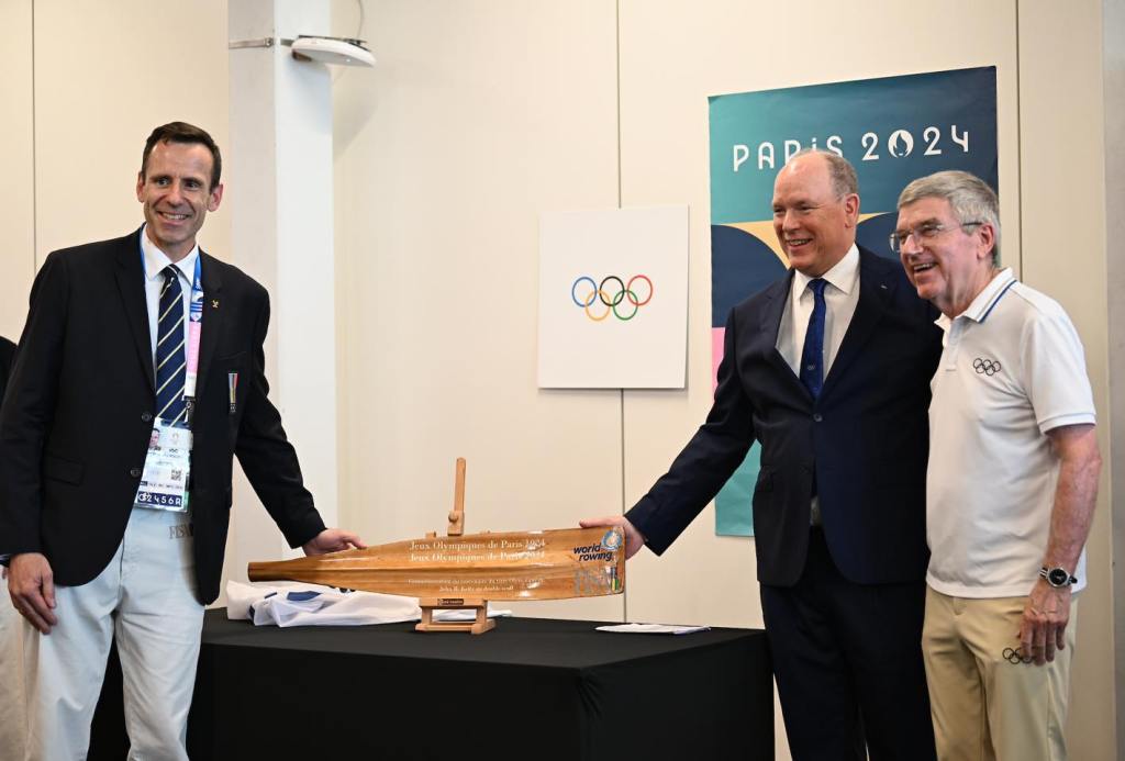 Anche Albert ha premiato gli atleti: ricordate il post con la mostra di fiamme olimpiche (Le foto del giorno – Collezioni bizzarre e dove trovarle)? Quella occasione era servita anche a ricordare il nonno materno del principe, Jack Kelly, campione olimpico di canottaggio agli altri Giochi organizzati a Parigi esattamente cent’anni fa. Bene, quest’anno Albert ha premiato i vincitori della stessa specialità: ad aggiudicarsi l’oro è stato il team rumeno, secondi gli olandesi e terzi gli irlandesi. È seguito un ricevimento col presidente del CIO in cui è stata ricordata l’impresa di Jack Kelly: come vedete sul tavolo c’è la pala di uno dei remi usati allora.