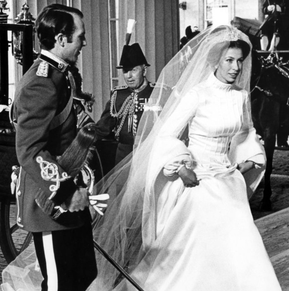 Il 14 novembre 1973 la storia sembrava diversa; 500 milioni di persone nel mondo, tra cui una Lady Violet ancora bambina, assistono al fiabesco matrimonio a Westminster Abbey. Lo sposo è il biondo Mark Phillips, aitante (allora) nella giubba rossa del suo reggimento, le Queen’s Dragoon Guards. La sposa è l’unica figlia della Regina, ha solo 23 anni e quel giorno è bellissima. Per il suo abito ha scelto Maureen Baker, stilista principale del brand di prêt-à-porter Susan Small, che crea un elegante modello ispirato allo stile Tudor. Sul capo della principessa brilla la stessa tiara che 26 anni prima ha indossato la madre, allora principessa Elizabeth.