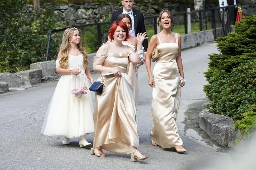 Per la festa di nozze anche i membri della famiglia reale che per la cerimonia indossavano l’abito tradizionale si sono cambiati; molto graziosa Amalie Giæver Macleod, cui Mette Marit ha prestato un vecchio abito Vera Wang, Purtroppo ora come allora il tessuto è pieno di grinze, ma lei è un delizia e il gesto pure, visto che i ragazzi sono così giovani che potrebbero lasciarsi domani.