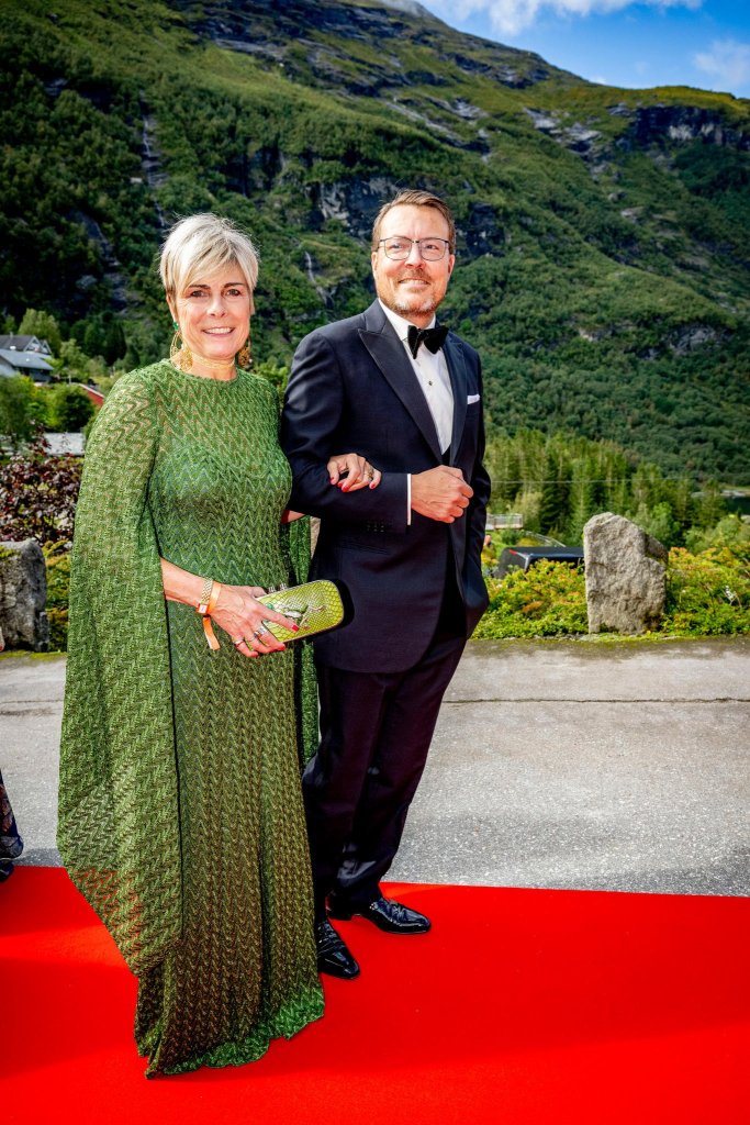 La famiglia della sposa è arrivata sotto una pioggia battente che non ha aiutato l’umore del sovrano, apparso piuttosto infastidito (eufemismo); loro alloggiavano sul panfilo reale, il Norge, e non in albergo come tutti gli altri. L’evento è stato il debutto in pubblico di Amalie Giæver Macleod, girlfriend di Sverre, figlio minore dei principi ereditari. Lei in rosso e bianco, lui con giacca da sera di velluto verde: da quel poco che si vede, mi sembrano chic.