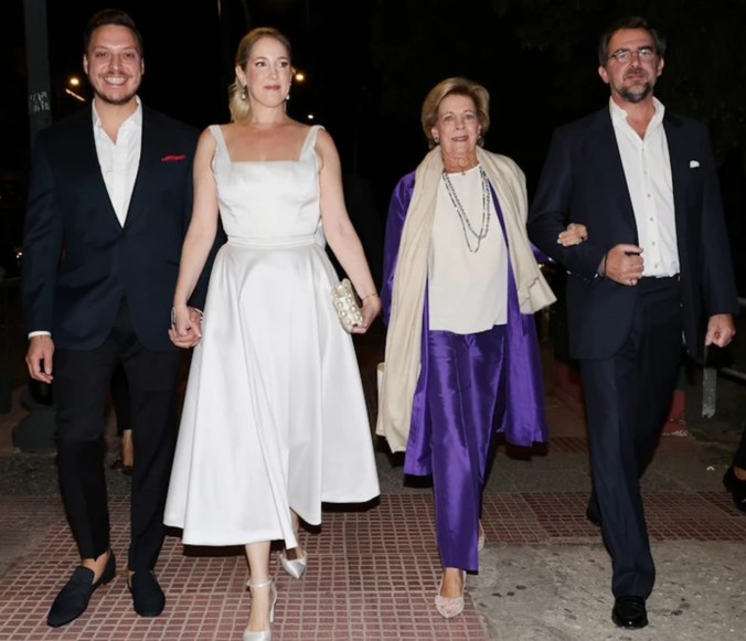 Nozze entrambe di non primissimo piano – bisogna accontentarsi – entrambe celebrano l’unione tra una principessa europea e un uomo americano. Questo però non è sciamano ma avvocato, non sono sicura che sia meglio ma potrebbe. La quarantunenne Theodora, una carriera finora non travolgente di attrice, ha dovuto rinviare la celebrazione più di una volta, prima per la pandemia, poi per la morte del padre. Per le mise si è affidata a Celia Kritharioti, proprietaria della più antica maison di Grecia, fondata nel 1906, e nonostante non mi sa piaciuto tutto penso abbia fatto bene, e non solo per questioni di opportunità. Iniziamo dunque col party organizzato la sera prima della cerimonia nelle sale del bel Museo Bizantino e Cristiano di Atene.