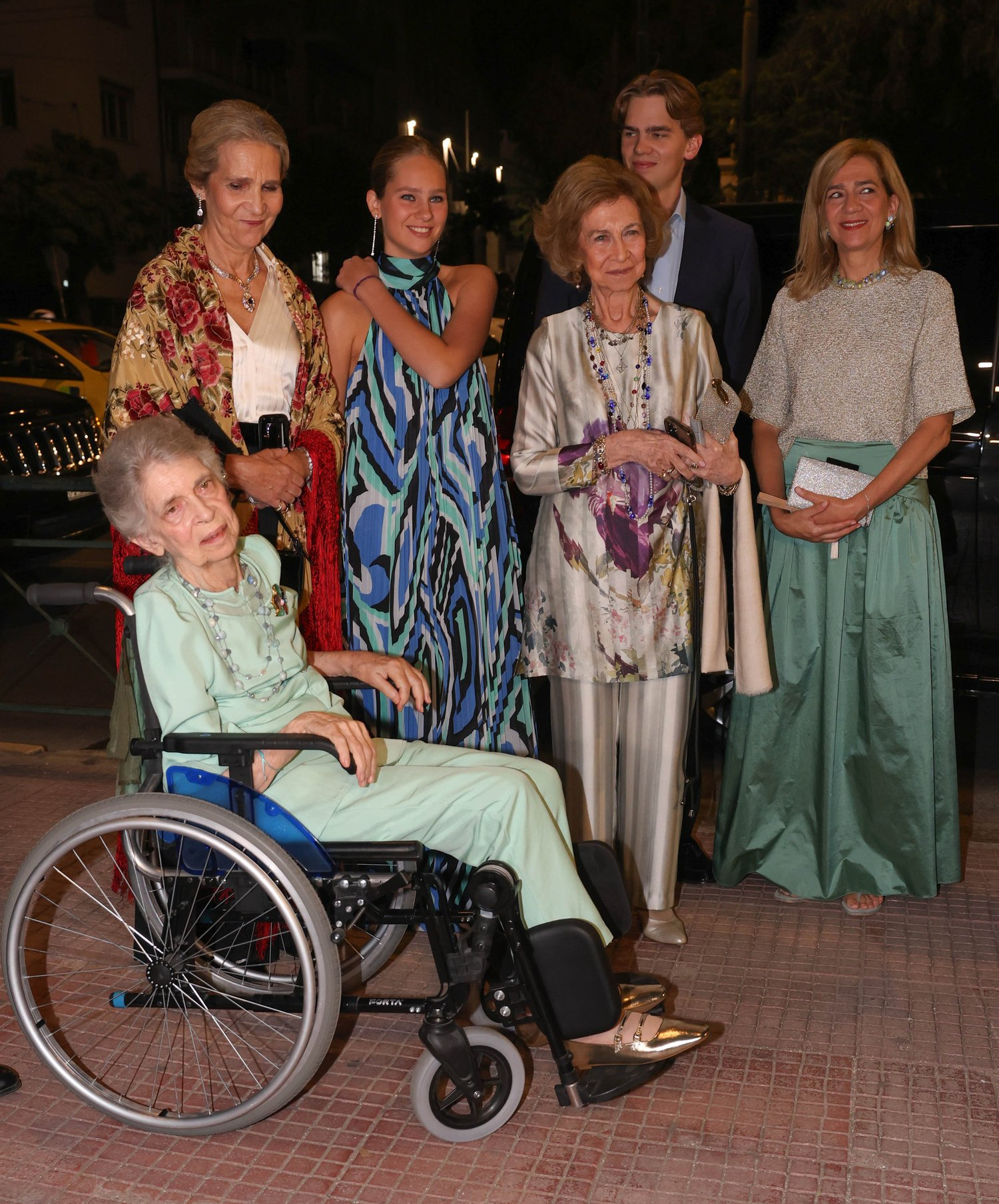 Meno ieraticamente perfetta della cognata ma più calda e comunicativa (si capisce che la preferisco?) la principessa Alexia, primogenita degli ex sovrani di Grecia – e per un paio d’anni, fino alla nascita del fratello Pavlos erede al trono – arriva con la sua bella faccia, il suo bel marito (Carlos Morales, architetto e velista spagnolo), i loro quattro bei figli. La sua mise è meno bella, o meglio un po’ pasticciata, ma tutto sommata adeguata a una festa di fine estate: splendidi i colori, troppo abbondante il tessuto della gonna, abbinata alla blusa incrociata in viscosa in vendita per 99,99 da El Corte Inglés, catena di grandi magazzini spagnola (al primo posto in Europa e al quarto nel mondo per volume d’affari). Boh. Deliziose le tre ragazze, che credo vestano Zara tutte e tre, chic come la parte maschile della famiglia.