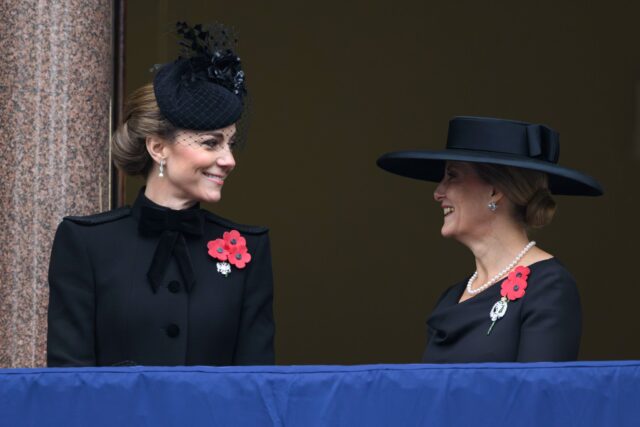 Al posto d’onore sul balcone del Foreign Office, e ancor più in vista data l’assenza della regina, la Principessa di Galles e la Duchessa di Edimburgo. Nei momenti di maggior concentrazione Catherine è apparsa con un viso assai segnato; però a dire il vero questo è accaduto anche negli anni precedenti. Probabilmente l’associazione tra la mise da lutto, la luce grigia di novembre e l’espressione di circostanza gioca brutti scherzi; per fortuna nelle immagini sorridenti il suo aspetto cambia completamente.