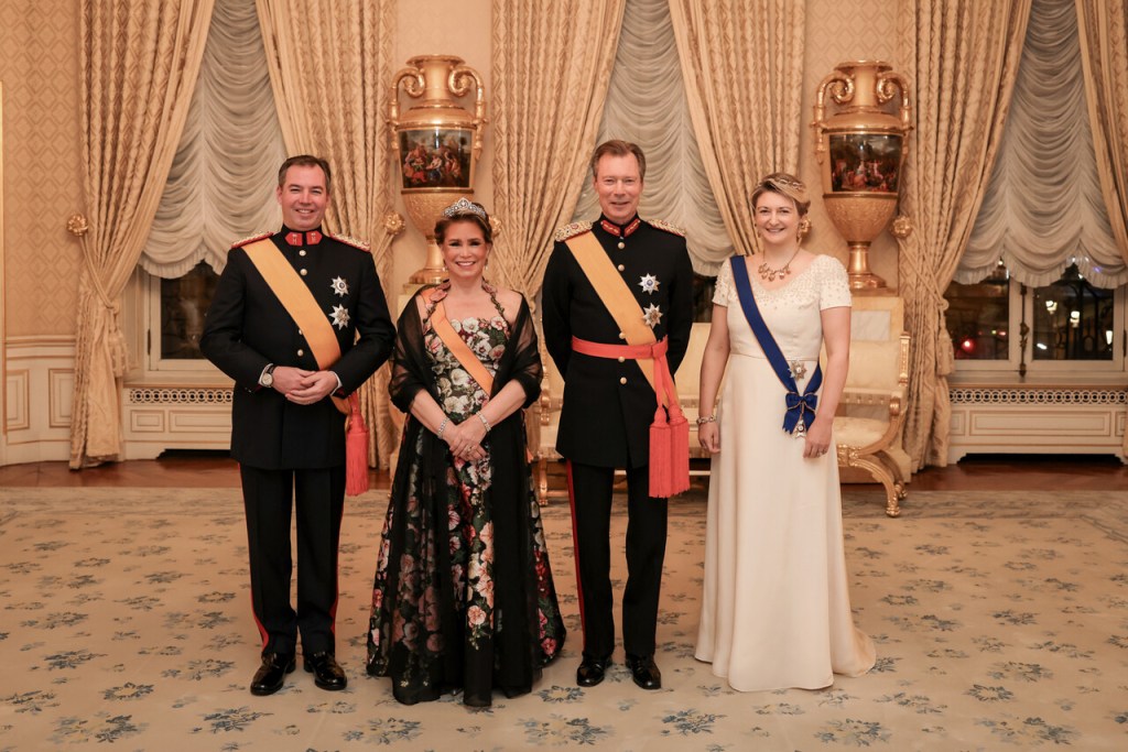Loro saranno tra i protagonisti del nuovo anno, ed eccoli schierati per il gala di inizio anno in Lussemburgo, in onore di politici, giudici, Corpo Diplomatico. La Granduchessa uscente, Maria Teresa, ha scelto un abito stile prendisole a grandi fiori del defunto Oscar de la Renta, cui forse la legano anche le comuni origine caraibiche (Cuba lei, Santo Domingo lui) e lo stile di vita internazionale. Opportunamente accessoriato con stola di chiffon nero, che non è ahimè sufficiente a coprire l’orrore della fascia dell’Ordine del Leone d’oro di Nassau infilata sotto la spallina. No dai, shock. Della Granduchessa uscente che vogliamo dire? Sicuramente meglio del solito – peggio non sarebbe facilissimo – Stéphanie indossa un abito bianco a mezze maniche senza infamia e senza lode. Boh di incoraggiamento.