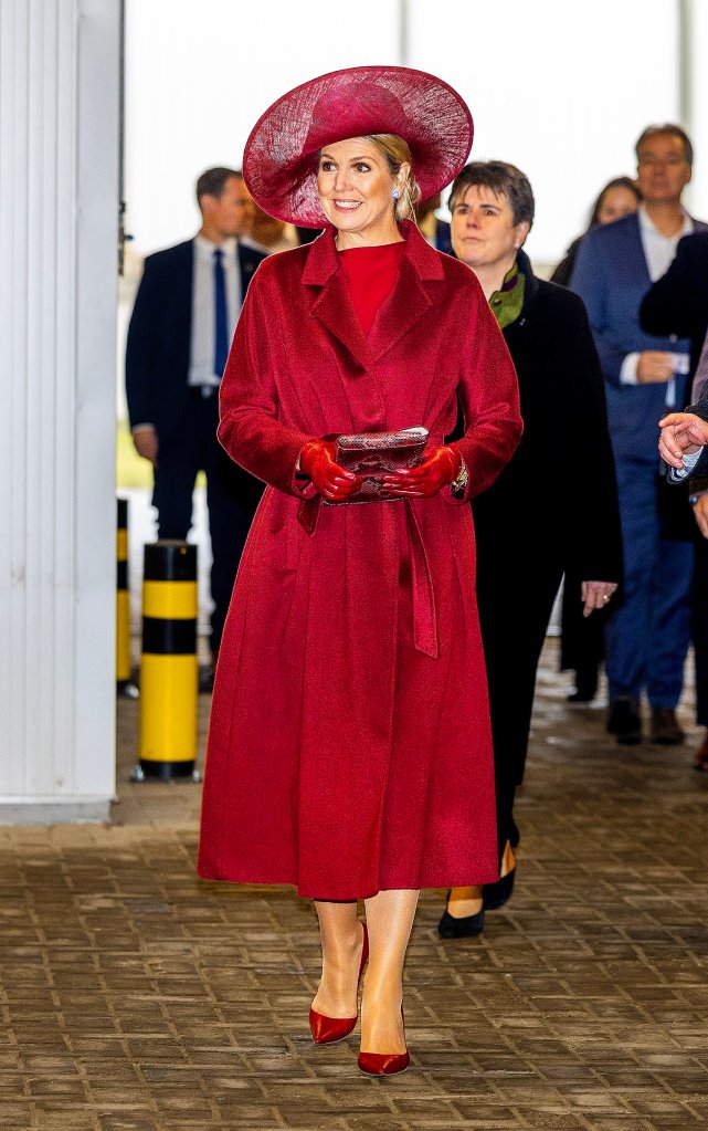 L’abbiamo trascurata un po’, e allora eccola nello splendore: Máxima nel più puro stile Máxima. Sinfonia di tonalità dal rosso intenso al bordeaux per una mise composta da tutti capi già indossati: cappotto Max Mara (bellissimo) gonna e blusa Natan, scarpe Gianvito Rossi, borsa Sophie Habsburg, cappello Fabienne Delvigne. Sarebbe chic, se non fosse per l’occasione.