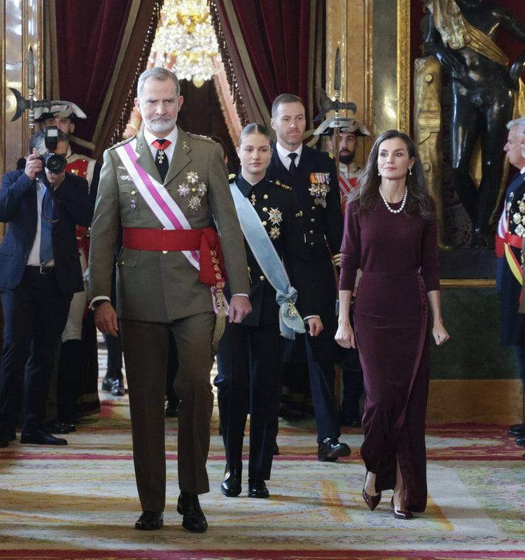 La Spagna il 6 gennaio celebra tradizionalmente le Forze Armate nel giorno della Pascua Militar. È una di quelle occasioni che richiedono il famigerato lungo da giorno, per cui il disastro è sempre in agguato. Letizia ha puntato sul colore dell’anno, il bordeaux, abbinando un pulloverino di cachemire Falconeri a una gonna a portafoglio che ha già indossato in occasioni analoghe.