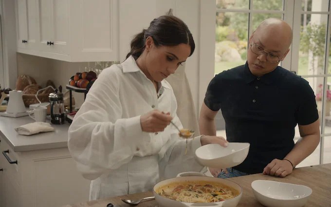 E a proposito di Royal Family, e di spare, alcuni di voi hanno chiesto il mio parere sulla spare’s consort e sul suo programma di lifestyle With love, Meghan, disponibile da qualche giorno su Netflix, per cui oggi ho guardato il primo episodiio. Premessa 1: non mi appassiona la tenzone Kate vs Meghan, che penso, aldilà delle intenzioni delle protagoniste sia costantemente attizzata da certa stampa e rinfocolata da chi è certo che il proprio parere faccia giurisprudenza. Premessa 2: forse anche a causa della notte insonne appena trascorsa ho seriamente rischiato di addormentarmi sul divano. Eviterò di soffermarmi sui dettagli: i gioielli indossati dalla duchessa, le sue mise, o le ricette un po’ così, a partire dalla pasta con pomodorini e buccia di limone cotta direttamente in padella aggiungendo acqua dal bollitore. Si tratta di una ricetta molto simile a quella della britannica Anna Jones ( https://annajones.co.uk/recipes/kale-tomato-and-lemon-zest-one-pot-spaghetti) che peraltro riscuote un certo successo tra chi l’ha provata.