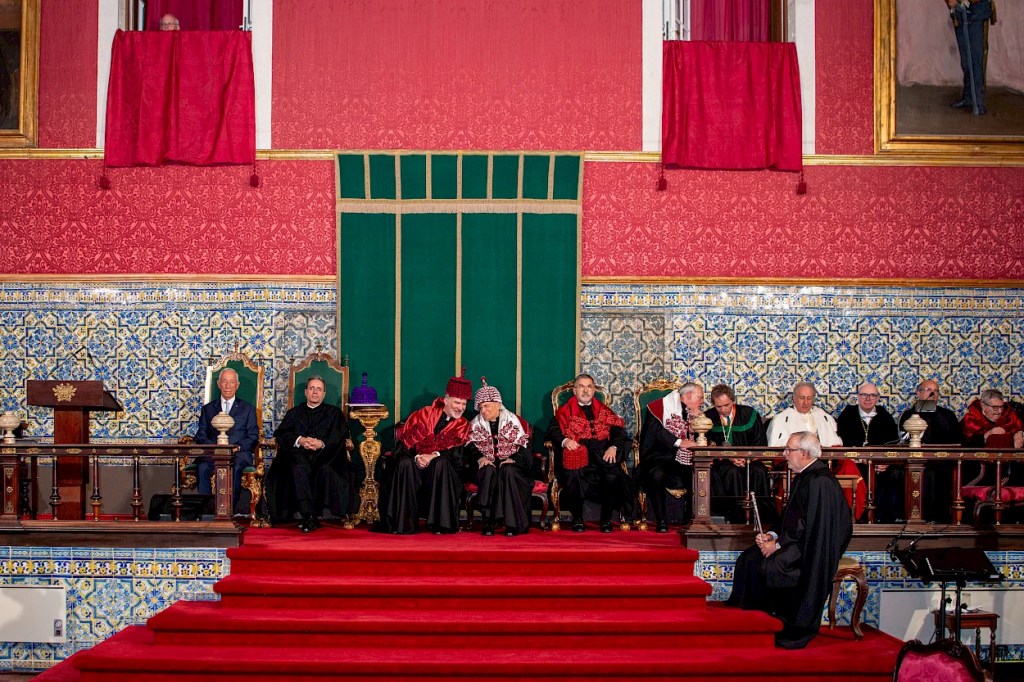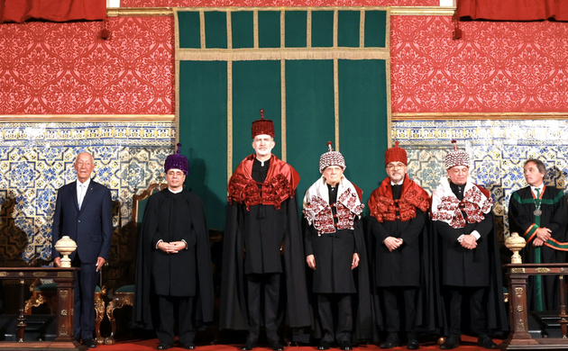 Il Portogallo è stato in questi giorni teatro dell’annuale riunione del COTEC, che riunisce i tre Paesi del Mediterraneo occidentale. El Rey Felipe VI e il Presidente Mattarella sono stati ospiti del Presidente lusitano Marcelo Rebelo de Sousa a Coimbra, sede dell’università che, fondata nel 1290, è la più antica del Paese e tra le più antiche al mondo. Potevano gli illustri ospiti non essere insigniti di una laurea Honoris Causa dall’altrettanto illustre ateneo? Ovviamente non potevano, e infatti ecco qui Felipe Dottore in Diritto e Sergio Dottore in Economia. L’uno in rosso, l’altro in bianco con decori rossi con la complessa e per certi versi affascinante tenuta dei membri del Senato Accademico: ricca mantellina decorata da coccarde e al posto del tradizionale tocco questo originale copricapo a torretta. Cosa darei per sapere cosa si dicevano i due così addobbati!