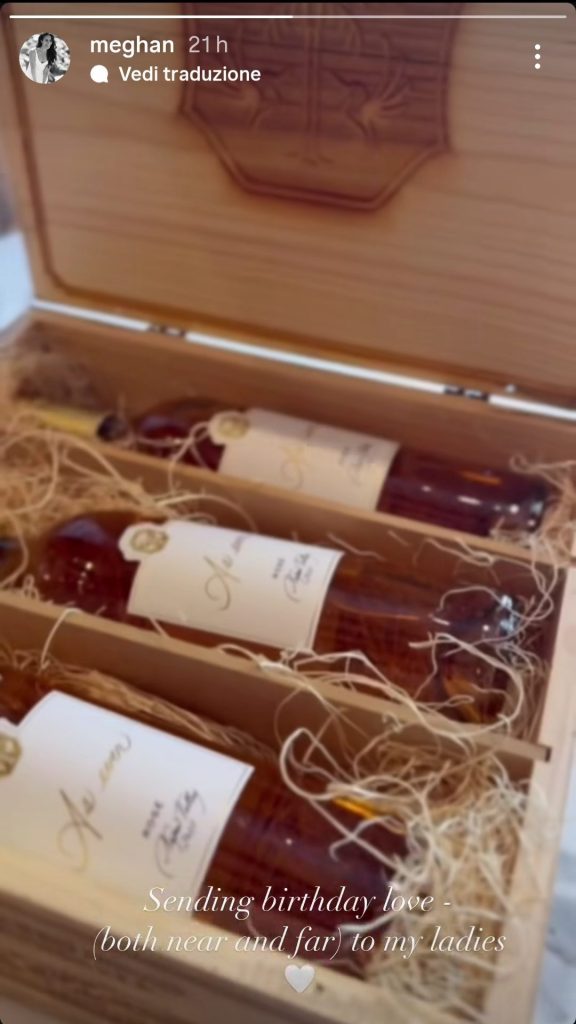 Gossip 2) Ieri The Queen Consort ha festeggiato il compleanno; una tranquilla festa English style con l’aggiunta di un bizarro dono, il titolo da Vice Admiral of the United Kingdom, prima donna a ricevere tale onore (A Royal Calendar – Compleanno!). Qualche ora dopo, compatibilmente col fuso orario, la seminuora fuggente Meghan ha a sua volta pubblicato una story nella quale impacchettava una cassetta di vino rosé, altro prodotto venduto con le insegne del suo brand As ever. Vi fornisco un fermo immagine da cui si può apprezzare il messaggio che dice: Inviare affettuosi auguri (vicino e lontano) per il compleanno delle mie signore. L’ambiguo messaggio ha fermato i pacemaker e sgonfiato le cotonature – non è mia ma è un’espressione che adoro – in molte redazioni e tra molti royalwatcher che si sono chiesti se fosse iniziato il riavvicinamento dei Sussex con un grazioso gesto rivolto a Camilla.