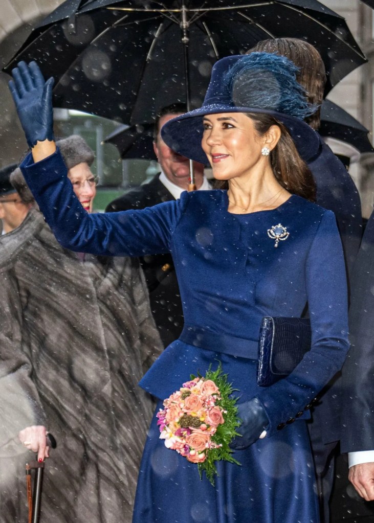 Le tre signore sono in viola, un caso? Non credo! E non ci crede neanche il magazine Billed-Bladet anche se non pensa a un omaggio a Lady Violet ma piuttosto a una scelta connessa al viola liturgico, che però non si usa in questo periodo; personalmente ipotizzo sia una scelta legata al colore che è comunque un simbolo di regalità. Interpretazioni e autocelebrazioni a parte, sotto la mantella blu notte Mary replica pari pari, gioielli a parte, la mise indossata per l’incoronazione di Charles e Camilla, tanto per far capire a chi si ispirerà (Royal chic shock e boh – Coronation edition (parte seconda). Tra l’altro il coat dress è opera di Søren Le Schmidt, che ha creato per lei anche l’abito bianco indossato domenica per divenire regina; e il cerchio si chiude.