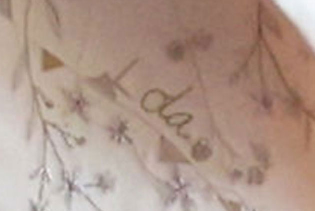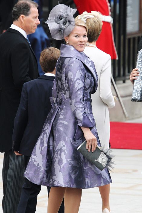 Quanto a Catherine, ho l’impressione che soffra il nuovo ruolo, e stia perdendo quel po’ di stile che aveva prima. In questo caso mi piace molto il cappello (Philip Treacy), inutilmente addobbato con uno dei bottoni dell’abito, che invece non mi fa impazzire. Per il resto: il colore e la spilla citano il reggimento, il colore da solo la nonna, la decorazione del cappello rimanda al vestito, il modello e gli orecchini alla suocera, lo stilista celebra il marito; più che una mise un gioco di società. Un grande, enorme boh.