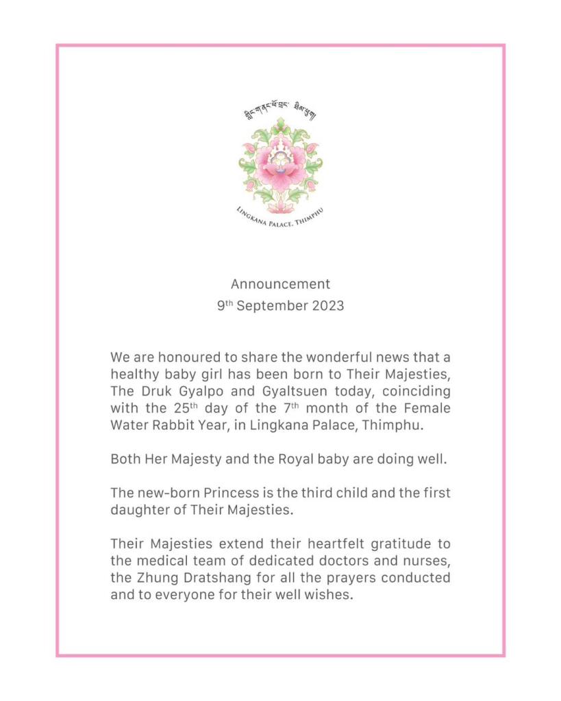 Il 9 settembre scorso arrivava dal Bhutan la notizia che la regina Jetsun Pema aveva partorito per la terza volta (Fiocchi rosa), dando alla luce una bambina dopo due maschi.