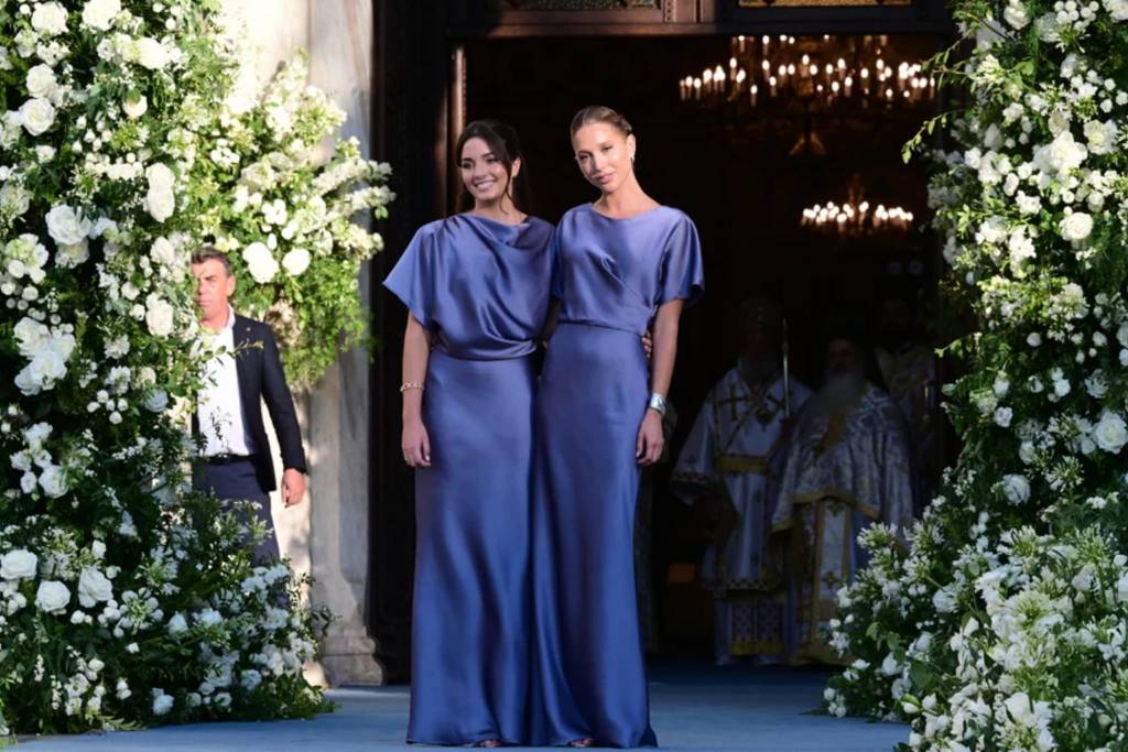 La stessa maison – la più antica di Grecia – che ha creato l’abito della sposa ha curato anche le mise delle damigelle. Abbastanza grandi per occuparsi davvero di strascico e velo, hanno svolto con grazia il compito due nipoti di Theodora: la bionda Maria-Olympia, figlia di Pavlos, e la bruna Arrieta Morales, figlia di Alexia. Entrambe inguainate da Celia Kritharioti in un abito di raso in una meravigliosa tonalità di blu, cui la più modaiola Maria-Olympia ha abbinato sandali d’argento di Prada e gioielli Bulgari. Entrambe deliziosamente chic.