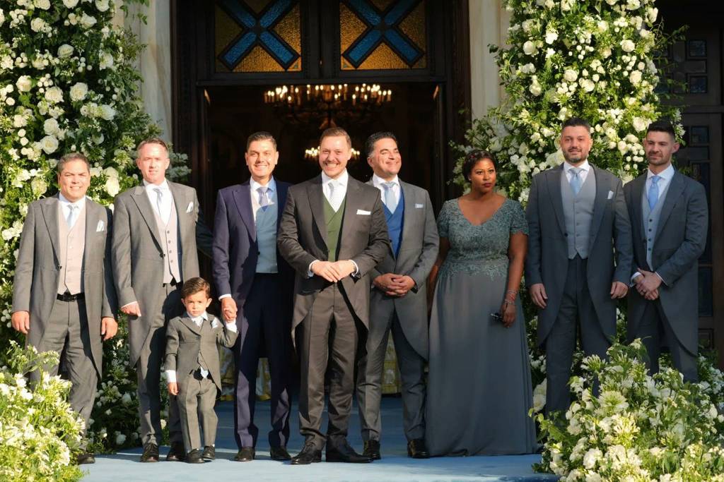 La famiglia dello sposo chiaramente si è impegnata e ha cercato di fare del suo meglio; non tutti sono particolarmente a proprio agio in tight, che peraltro dovrebbe essere realizzato da mani esperte. Mi permetto di dire che forse il peggiore è proprio lo sposo, con un gilet color sottobosco che veramente non ha alcun senso. Molto bella l’unica signora, con un onesto abito grigio ferro che non è il colore migliore per il suo incarnato. Boh per l’impegno (ma lo sposo per me è shock).