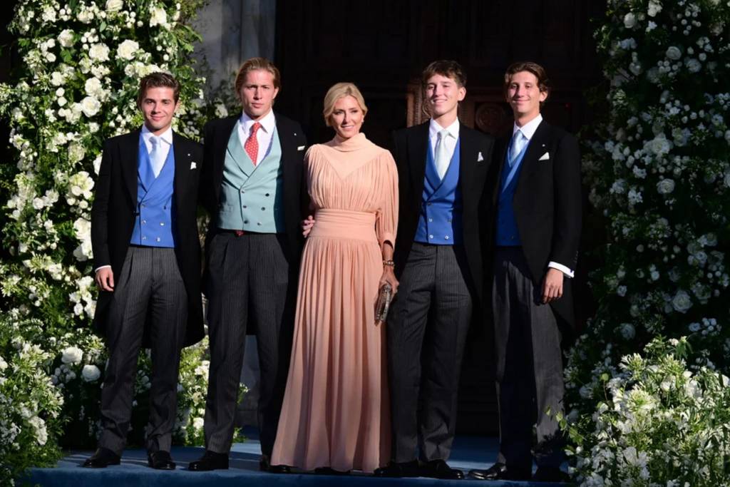 Preferisce un’elegante tonalità di rosa Marie Chantal, moglie del diadoco Pavlos; come quello indossato la sera prima per il prewedding party, anche quest’abito è Louis Vuitton con una clutch Aquazzura. Elegante senz’altro, un po’ noiosa nella sua perfezione che mi sa un pochino di insicurezza (o di troppa sicurezza). Chic. Devo dire che il suo aspetto già piacevole migliora ancora di più quando è scortata dai suoi quattro bellissimi figli. Quello che ha già attirato molte attenzioni è il maggiore, Tino, che qui vedete secondo da sinistra (e che l’anno scorso fu protagonista di un nostro post: Giovedì gnocchi! Constantine-Alexios) ma Lady Violet confessa una particolare simpatia per il primo a destra, penultimo dei figli della coppia, e dotato di un nome poetico come pochi: Odysseas-Kimon. Più che chic sono tutti un gran bel vedere.