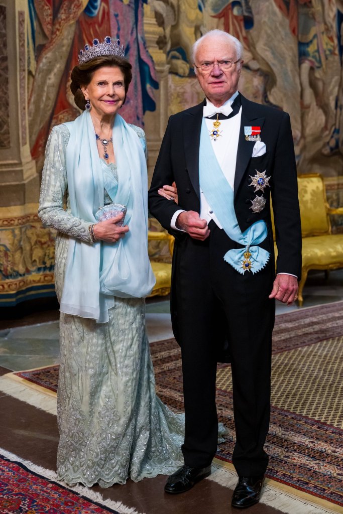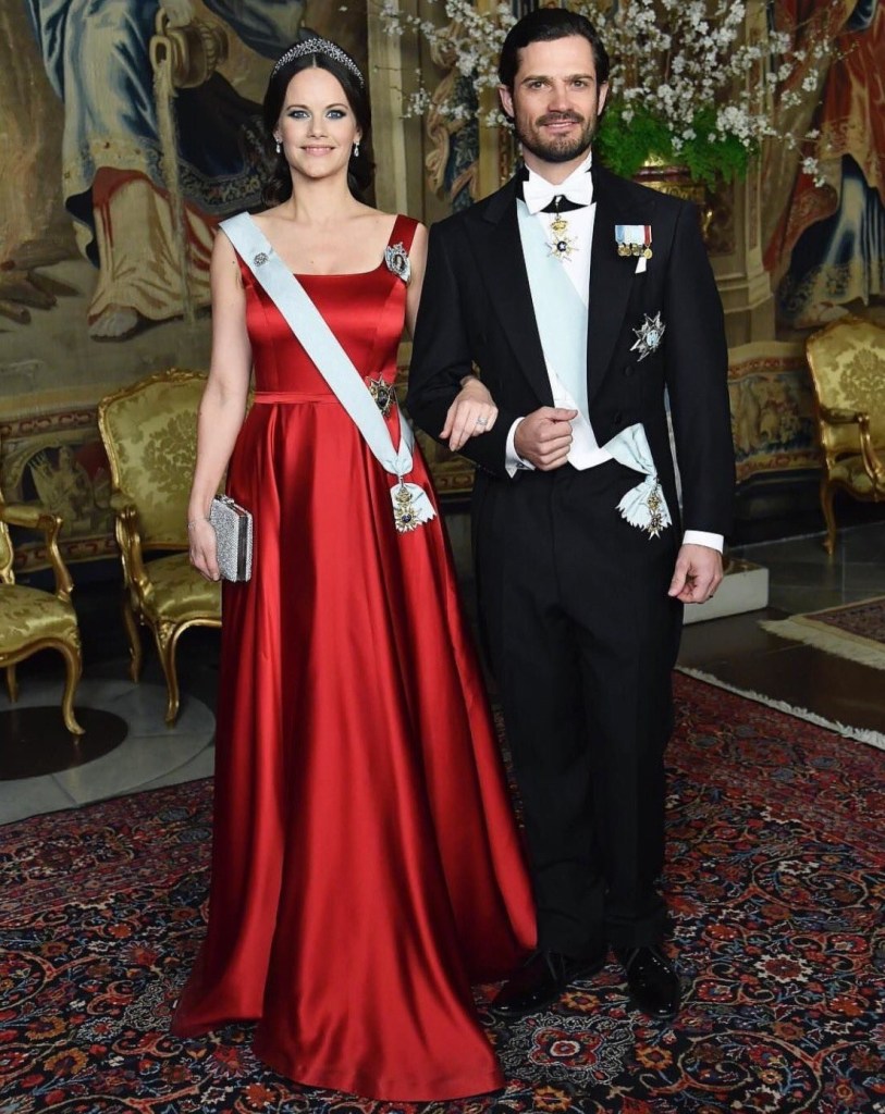 Completano la mise un cerchietto con veletta, un paio di Manolo Blahnik in camoscio nude, e la clutch Knot di Bottega Veneta, altro oggetto popolarissimo tra le teste coronate (infatti la portava anche la sorella Victoria, in un altro colore). A me piace, e non solo per il colore. Certo per noi è un po’ overdressed, ma considerate che le signore svedesi portavano anche la spilla del reale ordine di famiglia, e i signori erano in alta uniforme o in tight. Chic.