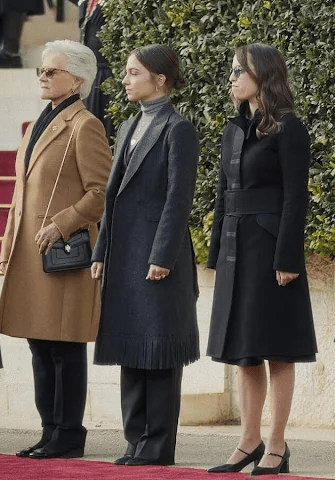 Invece sembra sia nuovo, per cui permane il mistero. Il modello ha uno scollo all’americana, di cui solitamente si apprezza il rigore geometrico, qui compromesso dall’aggiunta di quelle maniche che lo trasforma in un infelice cape dress; senza infamia e senza lode le scarpine LK Bennett, di un verde leggermente diverso. Shock. Quanto alle due prime dame, mesta e spettinata Laura Mattarella con una blusa nera dalle maniche a kimono su gonna bianco ottico che spara un po’; più divertente Maria Teresa infagottata in abito dalla forma indefinibile (Jean-Paul Knott), migliorato dalla bella collana. Un grande, enorme boh.