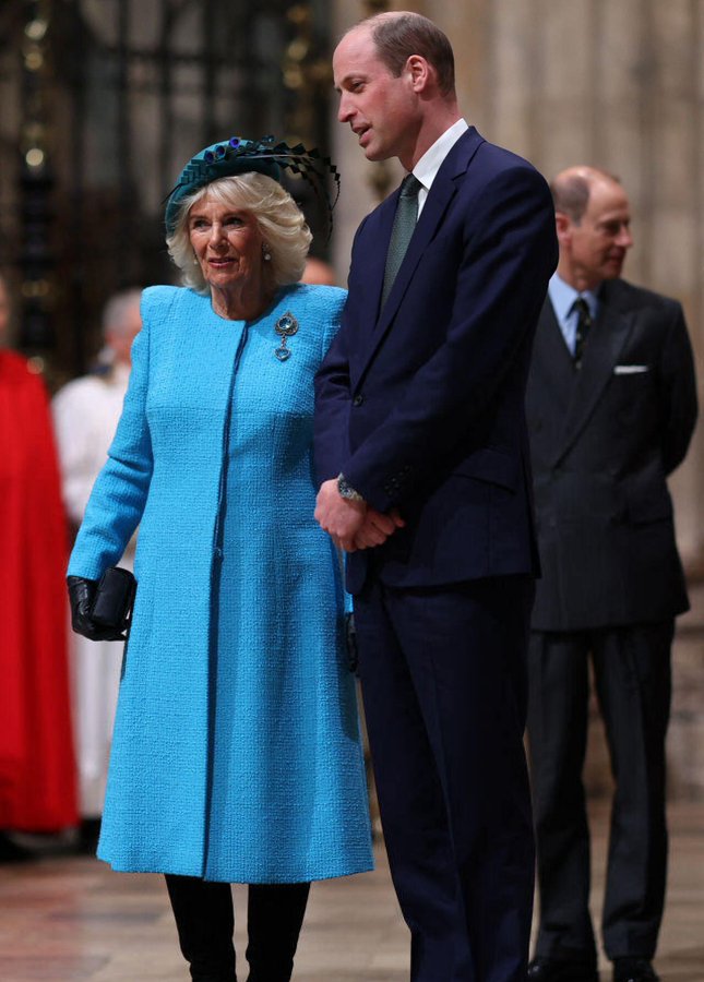 Il quarto giorno, venerdì, Camilla indossa una creazione della maison Anna Valentine, che la vestì per il suo royal wedding con Charles. Questa volta crea un robe manteau in un colore che a seconda della luce vira dall’azzurro al polvere. Lo completa un meraviglioso cappello piumato; la sovrana ne ha uno simile blu scuro, che penso abbia prestato alla figlia, che ho intravisto in una immagine. E della spilla, la famosa Jardine Star, ne vogliamo parlare? Chic.